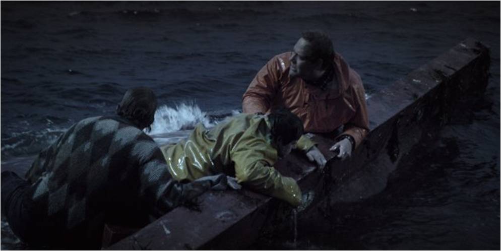 After the boat capsizes, the hero is seen clinging to the upturned hull with two companions, one if which is his childhood friend, called Palli. It soon becomes clear they’ll need to swim for their lives rather than wait in vain for rescue. However, Palli is in a bad way and doesn’t take long to succumb to the adverse conditions, despite help from his friend, and our hero, Gulli.