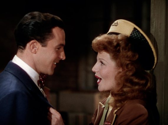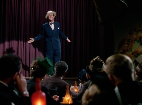There are other highpoints in Cover Girl, all involving Kelly. The song ‘Put Me to the Test’, while not a particularly memorable tune, is accompanied by a superb routine in which Kelly attempts to dance with a series of women, finally resorting to partnering a shop dummy which he suddenly finds replaced by Hayworth for a lovely finale. There is also a lengthy dancing-in-the-street routine by the three leads called ‘Make Way for Tomorrow’ which is interesting for its clear foreshadowing of moments in Singin’ in the Rain, as well as the revelation that Phil Silvers is not a bad dancer. But there’s something not quite right about ‘Make Way for Tomorrow’ and it is key in identifying one of the film’s major flaws. The three leads, Kelly, Hayworth and Silvers, are meant to be great pals and Hayworth and Kelly romantically involved. But there is little chemistry between any of the actors. The routine is immediately preceded by an excruciatingly brash bit in which the three ‘friends’ enter a restaurant, order oysters (which they hate) for the purpose of looking for a pearl in them. This tradition proves to be pivotal to the plot but it is oversold, with the three actors bellowing silly incantations with an ain’t-we-cute over-enthusiasm. In the process, the concept is undersold and the impression is less of three pals having a ball and more of three stars vying for the spotlight and fumbling the scene in the process. So when ‘Make Way for Tomorrow’ comes, it feels forced rather than joyous.