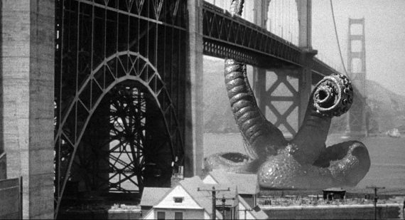 However, this being a Ray Harryhausen film, the set-pieces are fantastic. Budget and time constraints meant his octopus only had 6 arms, but it’s animated beautifully and the action is thrilling. The final 20 minutes when San Fransisco is trashed by the octopus is particularly exciting. Today we’re bored of watching landmarks and cities get destroyed by CGI that has been put together by a huge team of experts, but it’s still a lot of fun to see smaller scale damage created by the hands of literally just one man. Harryhausen designed the creatures, created the models and animated them himself, frame by frame, and the results still look great. You wouldn’t call it photo-realistic, but the creature feels alive and the attention to detail is still wonderful to see on screen.
