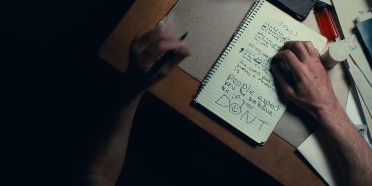Just take a second to read that page and examine it as it is perfect for a breakdown such as this. It tells you everything about his current mental state. He is trying to make it as a comedian, so is trying to get his jokes written down, but he can’t keep his concentration long enough to work on his jokes for his budding comic routine. Is that because he isn’t taking his medication that is beside his right hand? His jokes are pretty poor one liners, but slowly over the course of that page his mind has drifted from the task at hand and he is talking about his mental illness. “The worst part of having a mental illness is people expect you to behave as if you don’t”. That is terrific and very true even for the 80’s (when the film is set even though it looks like a film made in the 80’s set in the 70’s). But what I love is that as he loses concentration his handwriting also loses control of itself. It is fairly tidy at the top of the page, but it worsens the further we get down. He has no one he can trust to speak to about his thoughts and has to resort to writing it down, but when he does, because it is so traumatic for him to let it out of his brain, it is manic.