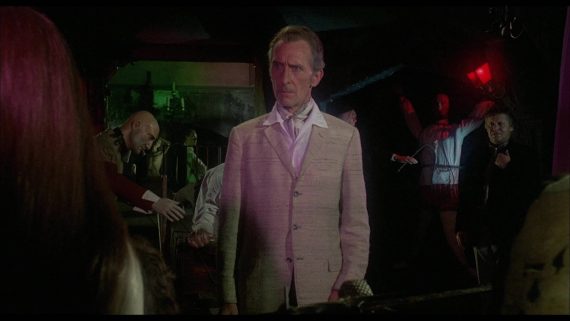 Things really pick up in “Sweets To The Sweet” in which a single father (Lee) moves into the house with his daughter. When he hires a teacher to homeschool her, unsettling truths begin to emerge about this family. This is a great little performance from Lee on typical brooding form as the strict father and while the twist does show its head before its reveal, there’s a nice nasty edge to this story that isn’t really present in the others. The final tale, “The Cloak” focuses on what happened to the actor. It all revolves around a prop cloak that he acquires from a mysterious shop to help him play a vampire in his latest film which has some curious side effects when worn. Jon Pertwee is a blast in this story, playing the aloof actor with gusto and adding a slice of black comedy to the proceedings with pokes at the cheesiness of the horror genre itself.