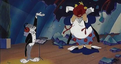 Chuck Jones’s Long Haired Hare is a much loved classic largely thanks to its final few minutes. Pitting Bugs against opera singer Giovanni Jones, Long Haired Hare is a typical example of how Warner cartoons set out to prick pomposity and expose those with lofty aspirations as just as ludicrous as the rest of us. As was usually the case with Jones’s take on Bugs, he is presented as an easy going, likeable character who is driven to extremes by the unforgiving nature of others. In the superb set up, Bugs’ jolly attempts to have a good old-fashioned sing-song are interrupted by the rotund opera singer who is attempting to practice nearby. Despite his violent reactions and destruction of Bugs’ instruments, the rabbit generously gives him a three-strikes-and-you’re-out chance. When he exceeds this, however, Bugs unleashes the full force of his revenge. The middle of the cartoon sags slightly while Bugs indulges in some pretty standard heckling (prime example: substituting a stick of dynamite for a pen) but its quickly compensated for by the unforgettable ending in which Bugs assumes the role of conductor and takes Giovanni Jones through a vocal tour de force which results in the collapse of the building. 2/3 of Long Haired Hare stands up against Jones’s (Chuck, not Giovanni) very best work and the remaining 1/3 is an enjoyable enough romp ensuring that the cartoon has comfortably and deservedly passed into legend.