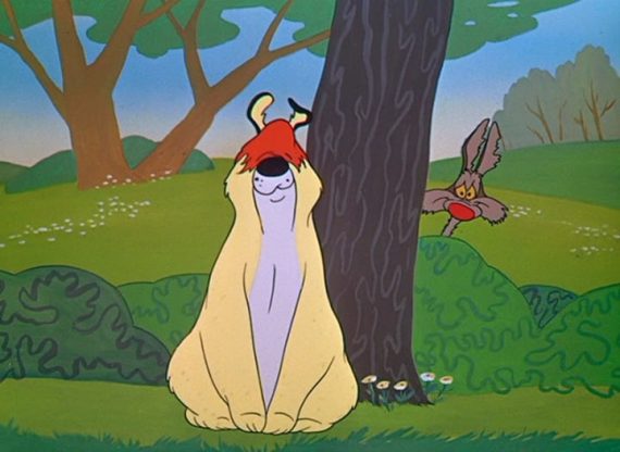 Chuck Jones’s Don’t Give Up the Sheep is the first of six cartoons Jones made with the lesser known characters of Sam Sheepdog and Ralph Wolf (although in this early entry to the series it is the Sheepdog who is called Ralph and the Wolf is unnamed). The first thing cartoon buffs will notice is that, but for his red nose, the Wolf is basically Wile E Coyote. What provoked this design decision is uncertain and it may have just been down to laziness but Jones later turned it into a brilliant comment on both the similarity and difference between the Sheepdog and Wolf shorts and the Road Runner series. The Wolf’s attempts to capture the sheep in a series of blackout gags could have been likened to the style of storytelling in the Road Runner cartoons but there’s a key difference that tells us that Ralph Wolf is completely different from Wile E Coyote. The Coyote is an insanely obsessive creature driven by his one track mind to catch and devour the Road Runner. The highly unusual opening scenes of the Sheepdog and Wolf cartoons, however, reveal that Ralph is simply fulfilling his duties as he punches in on a timecard like any other workaday stiff. His duties are presumably determined by either nature or the all powerful cartoonists. The fact that only the Sheepdog punches in at the beginning of Don’t Give Up the Sheep suggests that maybe Jones extension of this gag to the Wolf as well may have been a sly joke at the expense of those who accused him of repeating himself.