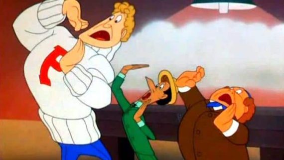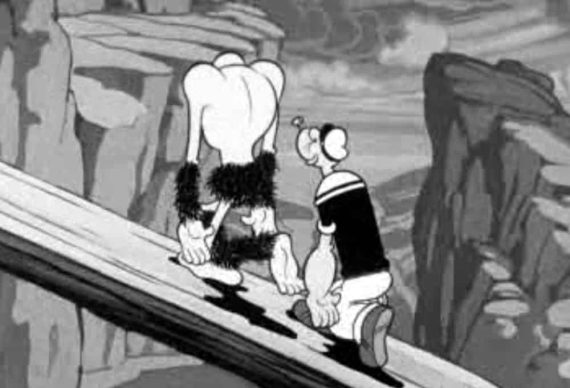 Goonland itself is a masterpiece beyond its animated firsts. Popeye’s adventures here seem to cinematically exceed the short running time. The story is beautifully told, with Jack Mercer’s brilliant mutterings as both Popeye and Pappy surpassing his other always brilliant performances. The Goons are wonderfully brought to life, especially in a scene where Popeye mimics their Neanderthal movements. It’s a surprise that these vivid characters never came back in a theatrical cartoon, although the comic strip creation Alice the Goon was memorably used as Olive Oyl’s fellow army cadet in a series of TV shorts for The All New Popeye Hour. Goonland is also fondly remembered for its memorable climax in which Popeye and Pappy are saved from the Goons when the film itself breaks, causing their enemies to fall off the screen, before a live action hand repairs the celluloid with a safety pin. It’s a wonderful little flourish from a studio that were especially adept at combining animation and live action from the earliest days of the medium’s inception.