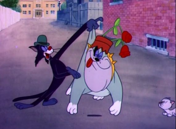 Chuck Jones’s Feed the Kitty is one of the undisputed classics of animation. It runs the gamut of moods from sweet to horrifying, hilarious to tear-jerking. The short made such an impression on director Joe Dante that he regularly pays tribute to it in his full length features. Starring a soft-hearted bulldog named Marc Anthony and a doe-eyed kitten named Pussyfoot, Feed the Kitty forsakes the usual anarchic mayhem of Warner Bros. cartoons for a disarmingly heartwarming tale of one dog’s adoration for a cat. Jones knows better than to revisit the Disney-esque cuteness of his dull early work and neatly sidesteps this by mixing the sweetness with plenty of laughs and an extremely dark sequence in which Marc Anthony thinks Pussyfoot has been chopped up and baked to death! Feed the Kitty subverts the usual setup for cartoons in which a big character causes chaos while trying to catch and eat a little character by making the motive for the chaotic antics the big character’s desire to protect the little character. Marc Anthony goes to extreme lengths to hide Pussyfoot’s presence from the owner he is sure will eject the kitten from the house. In doing so, Marc Anthony undoubtedly steals the cartoon. Cute and accurately kitten-like as Pussyfoot is, he is basically a prop. Marc Anthony, on the other hand, became world famous for his performance in this cartoon by virtue of his plethora of amazing facial expressions.