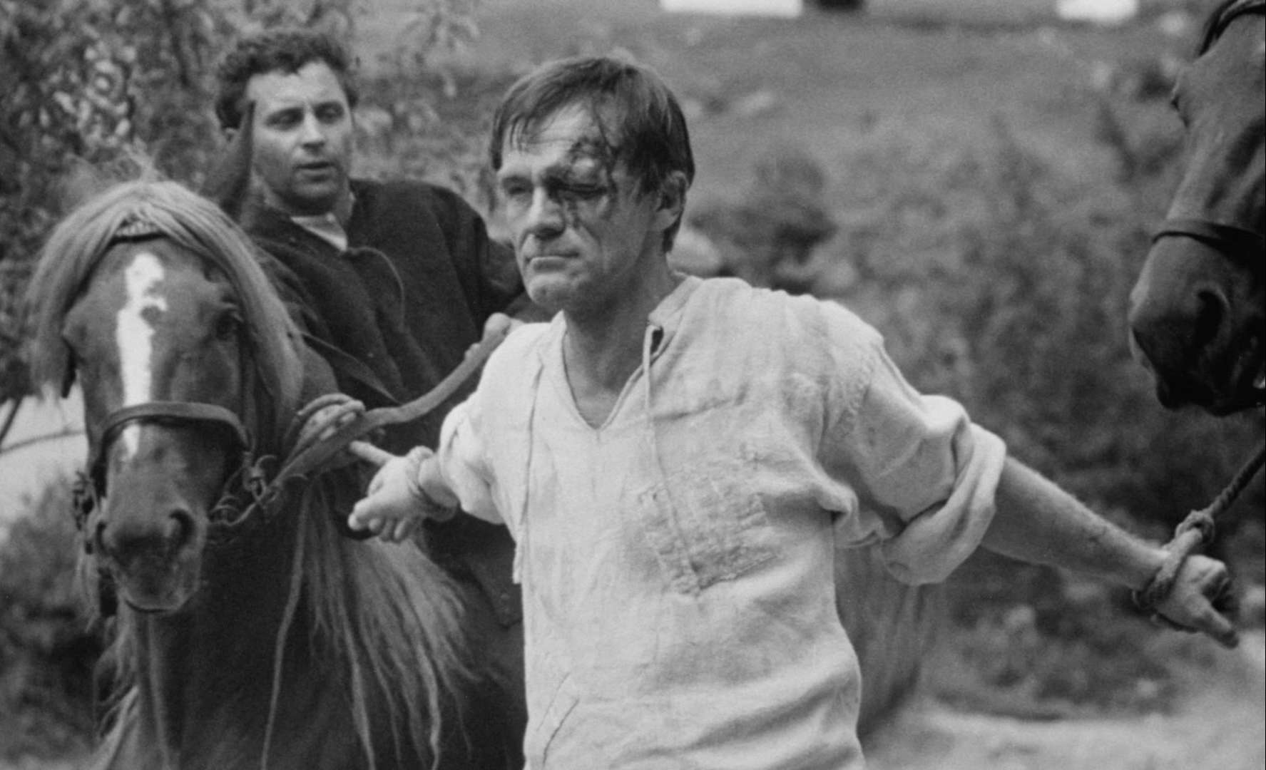 It’s the use of music and sound design that truly push this style into avant-garde territory though. The largely atonal score, which often uses voices as instruments, creates a thick, unsettling atmosphere. The sound design merges with this, frequently using the disembodied mutterings and whisperings of the conspiring villagers to further the sense of unease. Particular sounds are accentuated and sometimes dropped out too. For instance, during the cattle drive, at one point we only hear the musical clatter of the cowbells but not the cracks of Dragon and Šimon’s whips.