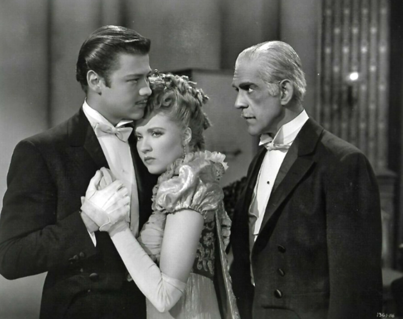 Beginning with Dr Hohmer (Karloff) sitting in a disused dressing room and remembering the murder, at his own hands, of opera diva and Hohmer’s wife, Marcelina, due to his jealousy of her sharing her singing gift with the world, the film then introduces two new arrivals to the Opera house, namely music student Angela Clarke (Foster) and her fiancée, Franz (Turham Bey). It turns out that Angela’s voice is very similar to Marcelina’s and consequently this sets Karloff off on a mission to prevent her singing in public, especially singing the opera ‘The Magic Voice’, which had been his wife’s speciality.