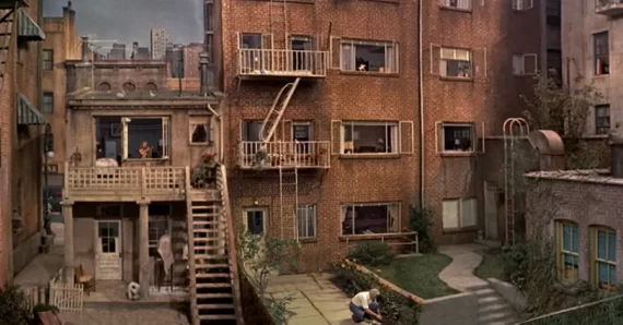 But what makes Rear Window really special is its unique and elaborate set design and Hitchcock’s direction of that set. Officially, Rear Window is the fourth and last of Hitchcock’s “limited-setting” films, in which the action is confined to one small space. In this case, that space is Jeff’s small apartment but from that limited space, Jeff and the audience can see a whole plethora of other small spaces through the windows of the adjacent apartment building. These multiple limited spaces build up into a microcosmic world, with numerous characters and stories, both humorous and sad, coexisting, supplementing and overlapping with the main narrative of the possibly murderous salesman living among them. Hitchcock’s camera roams this incredible set with the idle interest characteristic of owners of the recently invented TV remote, switching channels until one captures their interest. There are long silent passages of Rear Window in which the viewer is implicated in Jeff’s voyeurism, only cutting away from his viewpoint to remind us of his presence and allow us to compare our reactions with his. It’s a monumentally effective technique which draws the viewer in completely as they get lost in the act of looking.