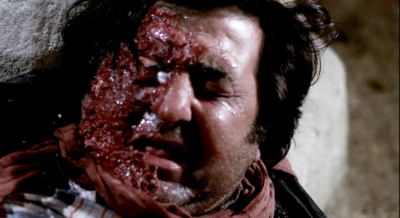 Out of the bat, The Living Dead Girl is arguably Rollin’s most graphic film. As Stephen Thrower points out on an extra feature included on the disc it’s a “Jean Rollin gore movie” with excellent special effects and graphic death sequences, the type that would become more prevalent during the 1980s, when this was made. Those special effects were created by the late great Benoît Lestang, who would later work on Brain Damage (1988), Baby Blood (1990), Brotherhood of the Wolf (2001) and whose final work would be on the French extremity classic Martyrs (2008). Those effects start with a graphic double eye gouging to one of the grave robbers and toxic waste melting half of the face of the other, with frequent gruesome death sequences ensuing.